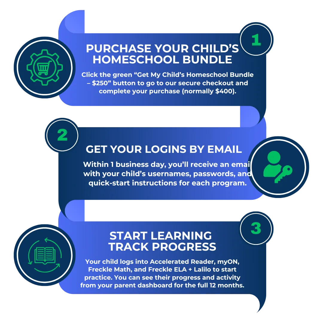 After you complete your purchase, you’ll receive an email within 1 business day with your child’s usernames, passwords, and quick-start instructions for each program. If you don’t see it, check your spam/junk folder or contact us and we’ll resend your setup email.